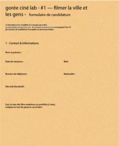 Ce formulaire est à compléter et à envoyer par mail à secretariat@ifc-pointenoire.com et info@goreecinema.com (indiquer dans “objet” : Candidature Gorée Ciné Lab + Renommer le formulaire : goreecinelab_NOM_PRÉNOM) accompagné d’un CV (les dossiers de candidature incomplets ne seront pas traités)
